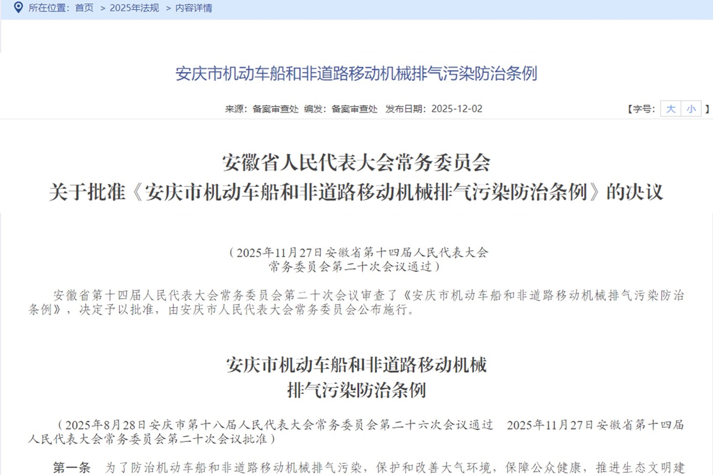 安徽省人大常委會(huì)批準(zhǔn)《安慶市機(jī)動(dòng)車船和非道路移動(dòng)機(jī)械排氣污染防治條例》