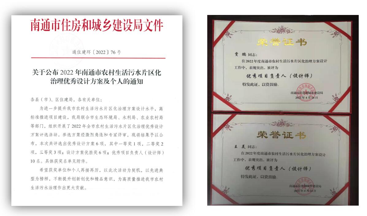 工程設(shè)計分院獲評南通市農(nóng)村生活污水片區(qū)化治理優(yōu)秀設(shè)計方案及優(yōu)秀設(shè)計師