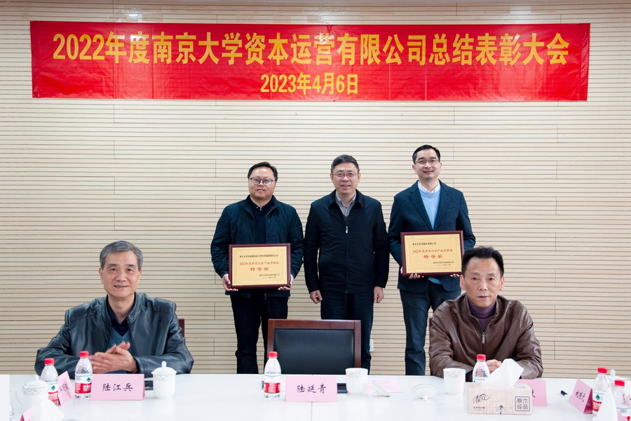 4月6日,2022年度南京大學資本運營有限公司總結表彰大會在鼓樓校區召開,南大環規院和南大出版社繼續蟬聯“南京大學產業貢獻特等獎”,南京大學副校長陸延青教授向集團常務副總裁吳俊鋒頒發了獎牌,這是環規院第六次蟬聯南京大學科技產業最高獎。
